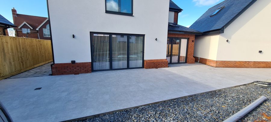 Minima Sand concrete-look porcelain tile installed on a patio.